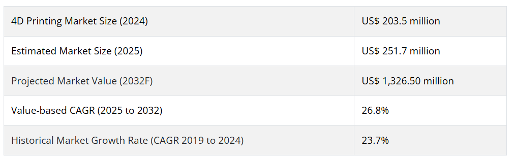 Persistence Market Researchによると、グローバル4Dプリンティング市場は2025年から2032年にかけて年平均成長率(CAGR)26.8%で著しい成長を示すと推定されています。2019年から2024年の歴史的期間には、CAGR23.7%で驚異的な成長を示しました。