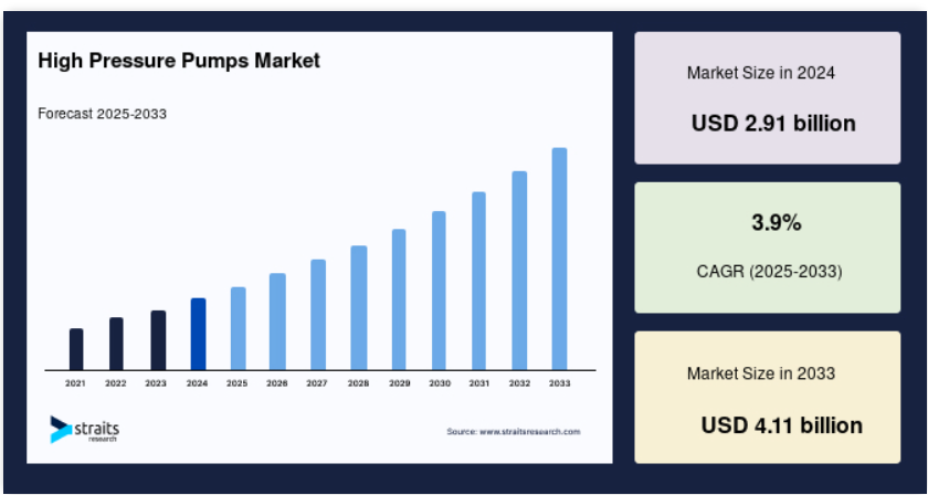 世界の高圧ポンプの市場規模は2024年に29億1000万米ドルと評価され、2025年には30億2000万米ドル、2033年には41億1000万米ドルに達し、予測期間(2025年~2033年)のCAGRは3.9%になると予測されています。発電所、精製所、パイプラインなどのエネルギーインフラの拡大により、高圧ポンプの需要が高まっています。