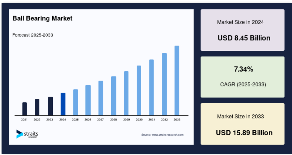 世界のボールベアリング市場規模は2024年に84億5000万米ドルと評価され、2025年の90億7000万米ドルから2033年には158億9000万米ドルに達し、予測期間(2025年~2033年)のCAGRは7.34%と成長すると予測されています。