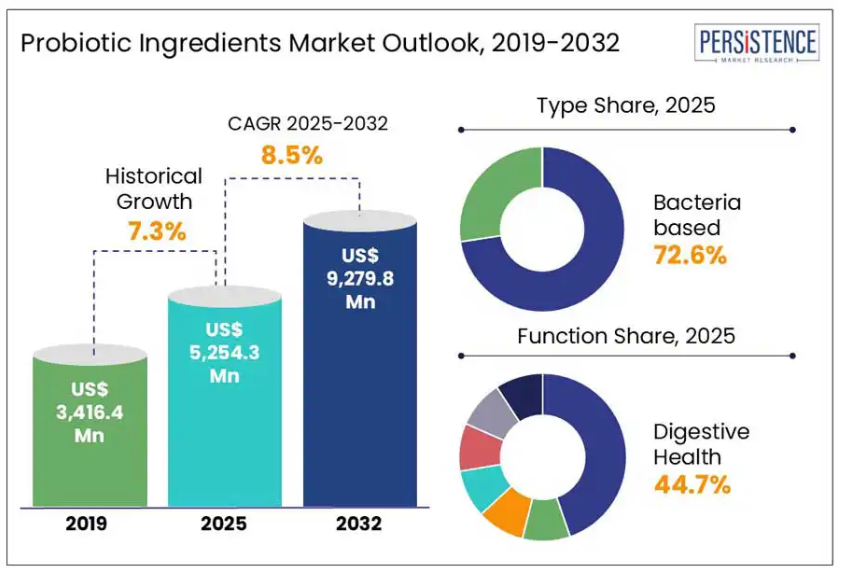 世界のプロバイオティクス成分市場規模は、2025年の52億5,430万米ドルから、2032年には92億7,980万米ドルに成長すると予測されています。