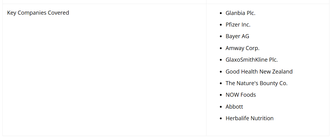 市場の主要企業には、Glanbia Plc、ファイザー社、バイエル社、アムウェイ社、グラクソ・スミスクライン社、グッドヘルス・ニュージーランド社、ネイチャーズ・バウンティ社、NOW Foods 社、アボット社、ハーバライフ・ニュートリション社などがございます。