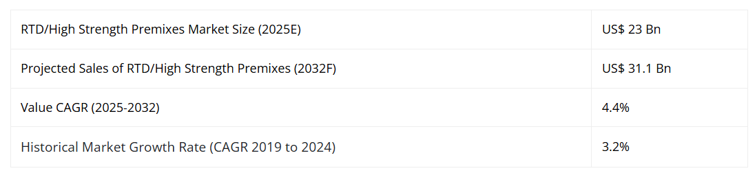 RTD/高アルコール度数プレミックスの市場は、4.4%の価値ベースの年平均成長率(CAGR)で拡大し、2032年までに収益が230億ドルから約311億ドルへ増加すると予測されます。