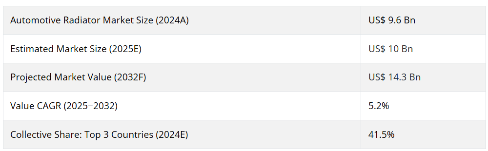 自動車用ラジエータの世界売上高は2025年末時点で約100億米ドル。同市場は2032年までに年平均成長率5.2%を記録し、評価額は143億米ドルに達すると予測されています。