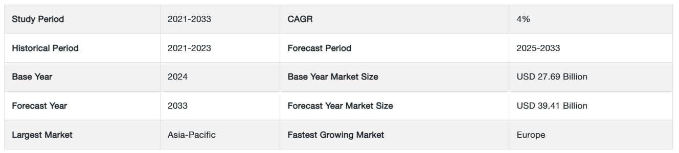 世界の工業用ゴム市場規模は2024年に276.9億米ドルと評価され、2025年には288.0億米ドル、2033年には394.1億米ドルに達すると予測され、予測期間中(2025年~2033年)の年平均成長率は4%で推移すると予測されています。