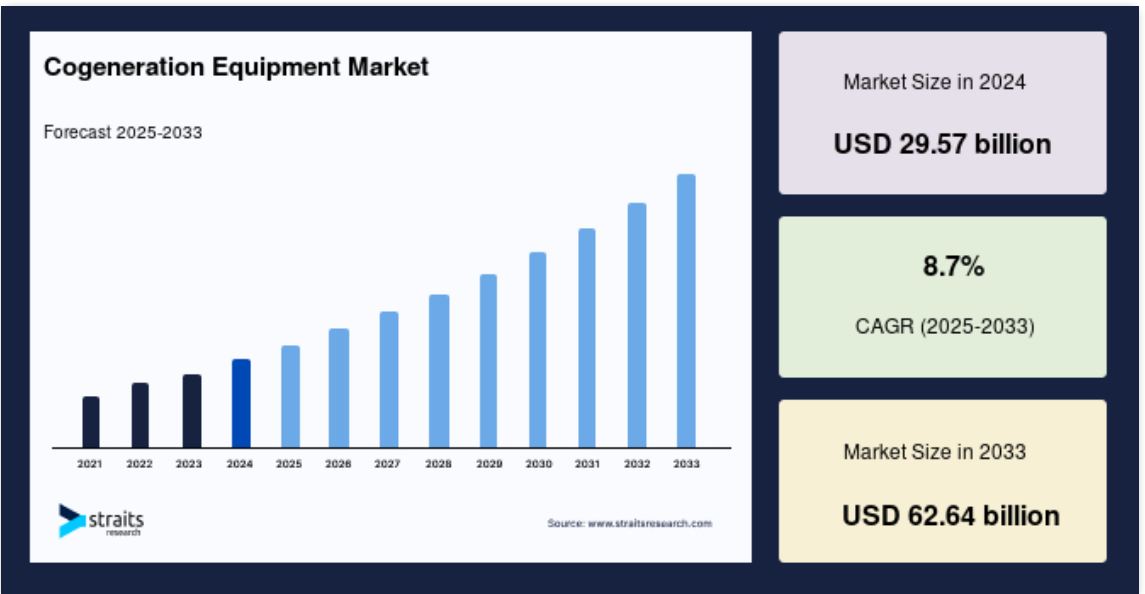 分散型エネルギー発電と分散型エネルギー資源(DERs)のトレンドは、コージェネレーション機器にとって魅力的な可能性を生み出します。コージェネレーションシステムは、自家発電と熱エネルギー生産を提供し、系統停電に対する回復力、信頼性、安全性を可能にします。企業や地域社会がエネルギー安全保障の向上、集中型送電網への依存度の低減、より強靭なエネルギーシステムへの移行に努める中、コージェネレーションは、地域密着型のエネルギー発電と消費のための拡張可能で費用対効果の高い代替手段を提供します。
