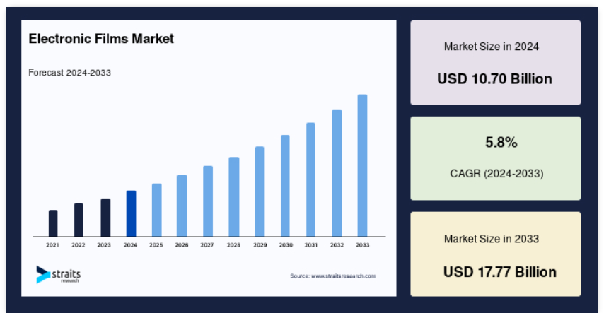 電子フィルムの世界市場規模は、2024年に107億米ドルと評価され、2025年には113.2億米ドル、2033年には177.7億米ドルに達すると予測され、予測期間中(2025年〜2033年)のCAGRは5.8%で成長すると予測されています。