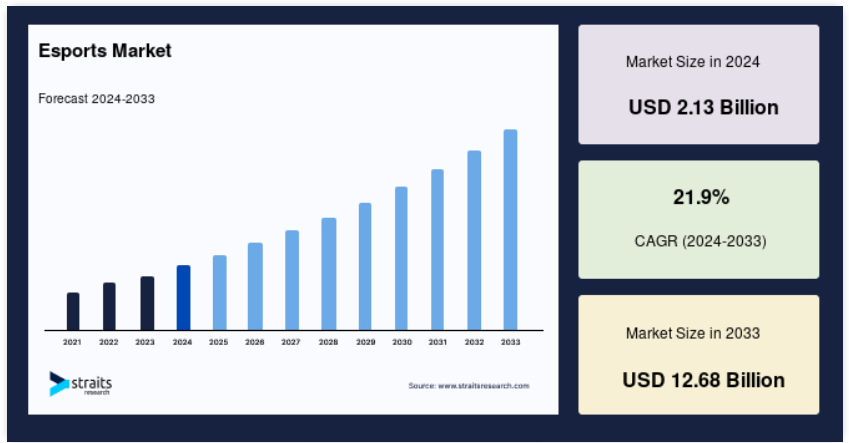 世界のEスポーツ市場規模は2024年に21.3億米ドルと評価され、2025年には26.0億米ドル、2033年には126.8億米ドルに達すると予測され、予測期間中(2025年〜2033年)のCAGRは21.9%で成長すると予測されています。