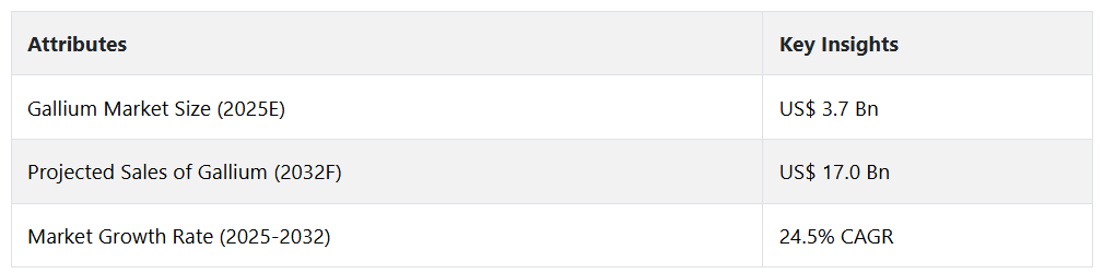 Persistence Market Researchによると、世界のガリウム市場は、2025年の37億米ドルから2032年には170億米ドルに成長し、年平均成長率(CAGR)は24.5%になると予測されています。