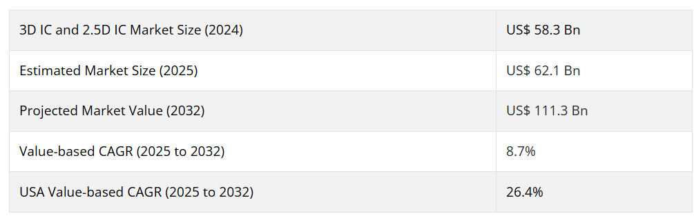 世界の3D ICおよび2.5D IC市場は、2032年に1,113億米ドルに達すると予測され、2025年から2032年までのCAGRは8.7%、2025年の世界市場の評価額は約621億米ドルと予測されています。