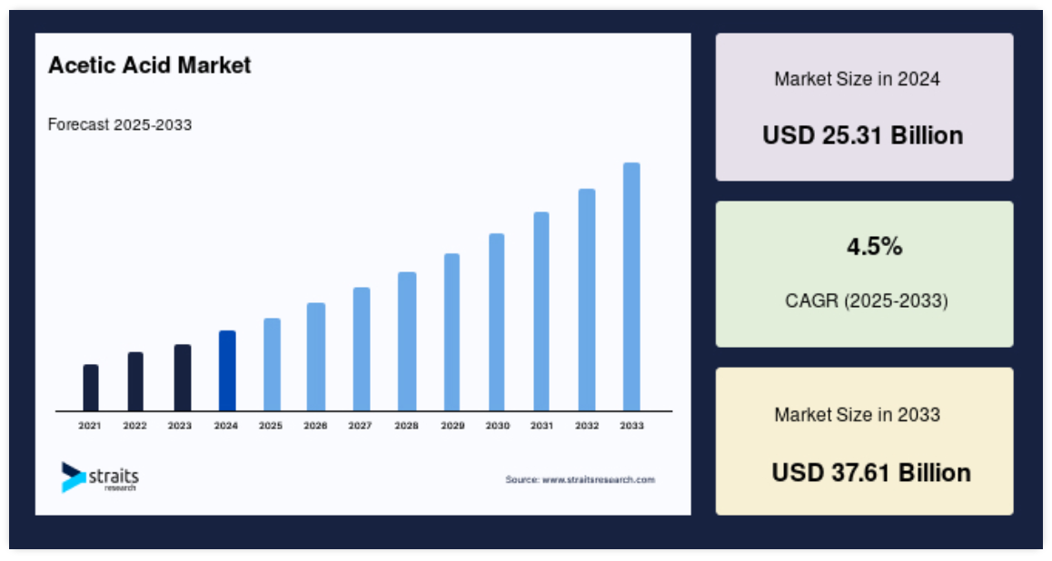 酢酸市場規模は2024年に253.1億米ドル、2025年には264億5,000万米ドル、2033年には376億1,000万米ドルに達すると予測され、予測期間中(2025年~2033年)の年平均成長率は4.5%です。