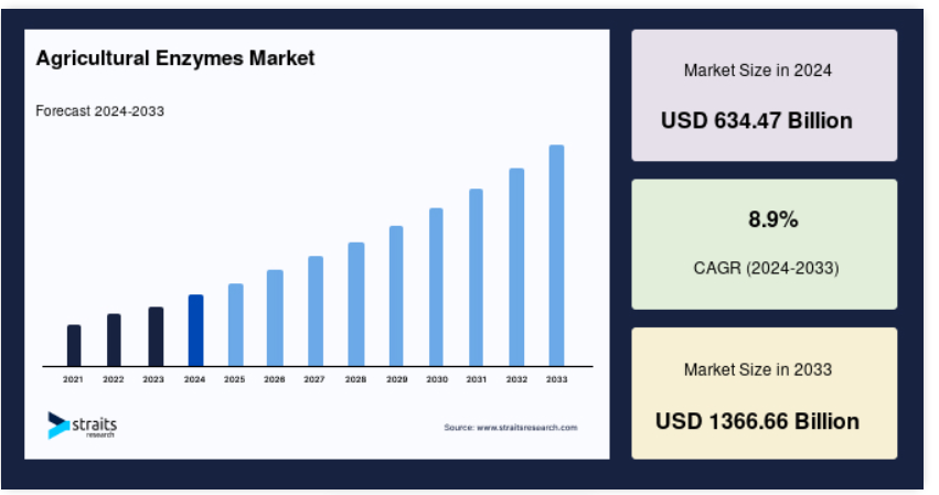 酵素は生分解性であるため、健康面やその他の利点から、世界は従来の農法から有機農法へと移行しつつあり、それにより世界の農業用酵素市場が牽引されています。さらに、環境への影響が最小限であることから、生物由来の農業製品に対する需要が高まっており、市場拡大を後押ししています。農業用酵素は、化学反応を促進して土壌の栄養素を放出する生物学的触媒です。農業用酵素は土壌の栄養素を放出して植物の根が利用できるようにします。農業用酵素がなければ、これらの栄養素は土壌中で不溶性で植物が利用できない状態のままだったでしょう。これらの酵素は、農薬、除草剤、化学肥料を使用した土壌を浄化することで、植物の収穫量と品質を向上させます。