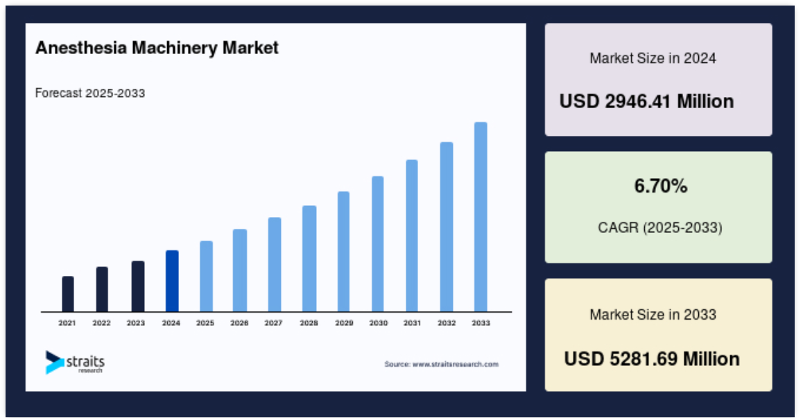 麻酔モニタリングの技術開発や手術件数の増加などの技術が、2033年までに麻酔機械市場の需要を大きく牽引。
