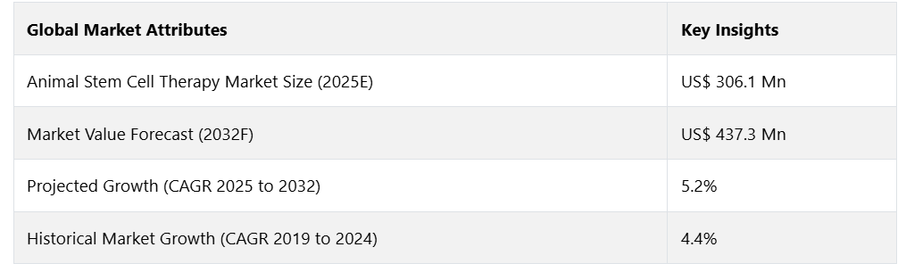 2025年から2032年にかけて、動物幹細胞治療業界は年平均成長率(CAGR)5.2%を達成する見通しです。 予測期間中、いくつかの疾患の治療法として、幹細胞治療が獣医学で普及すると見込まれています。 最近の研究では、動物における軟組織損傷のような症状の管理に有効であることが示されています。