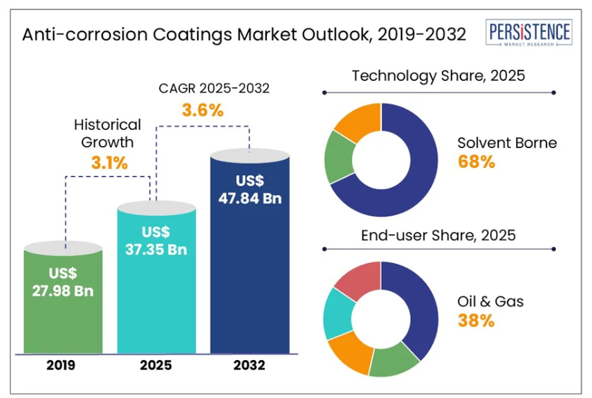 さらに、2025年から2032年までの予測期間において、市場は年平均成長率(CAGR)3.6%を記録すると見込まれております。Persistence Market Researchの報告書によりますと、建設、インフラ、自動車、船舶用途で使用される金属部品の錆や腐食を抑制するコーティング剤への需要増加が、市場成長を牽引しております。