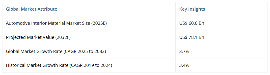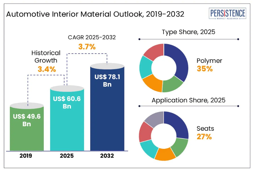 世界の自動車内装材市場の規模は、2025年の606億ドルから、予測期間である2025年から2032年にかけて年平均成長率(CAGR)3.7%で成長し、2032年までに781億ドルに達すると予測されております。