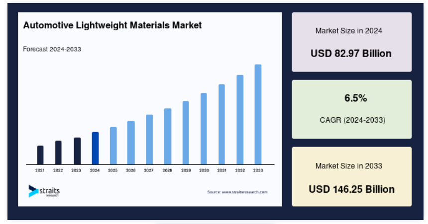 近年、環境問題への関心が高まっていることから、自動車業界では燃費効率と排出ガス削減が注目され、世界市場を牽引しています。さらに、自動車用軽量材料の製造プロセスの進歩も、市場成長の機会を生み出すと予想されます。