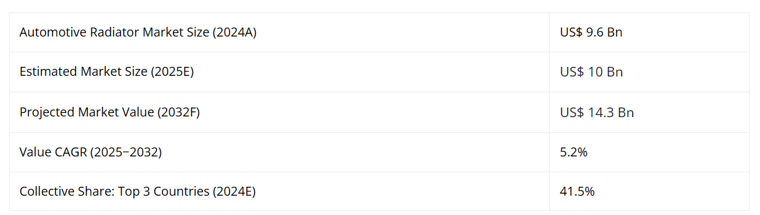 技術開発の進展により、自動車用ラジエーター市場には収益性の高い機会が生まれています。パーシステンス・マーケット・リサーチ社は、2032年までに5.2%の年平均成長率(CAGR)で市場が拡大すると予測しています。