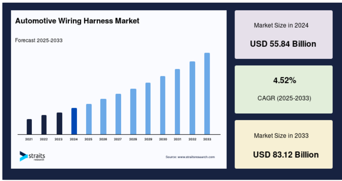 自動車用ワイヤーハーネスの世界市場規模は、2024年には558.4億米ドルでしたが、2025年には583.6億米ドル、2033年には831.2億米ドルに達すると予測され、予測期間中(2025年~2033年)の年平均成長率は4.52%です。