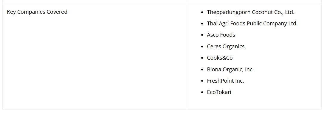 バナナの花の市場における主要企業は、Theppadungporn Coconut Co., Ltd.、Thai Agri Foods Public Company Ltd.、Asco Foods、Ceres Organics、Cooks&Co、Biona Organic、FreshPoint Inc.、EcoTokari、Upton’s Naturalsです。