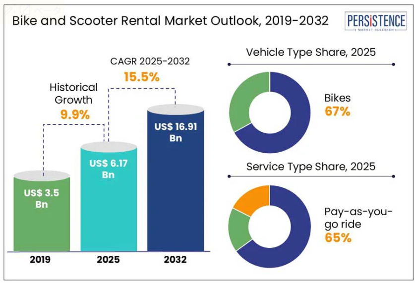 Persistence Market Researchの報告書によりますと、この成長は、効率的で持続可能な交通手段への需要の高まり、従来型車両が引き起こす環境リスクへの認識の拡大、そして自転車やスクーターのレンタルといったマイクロモビリティソリューションの費用対効果と利便性によって牽引されております。