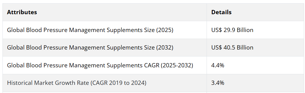Persistence Market Researchが新たに発表した血圧管理サプリメント市場分析レポートによると、2025年の血圧管理サプリメントの世界売上高は299億米ドルにとどまりました。2025年から2032年までのCAGRは4.4%と予測されており、予測期間の終了時には市場規模は 405 億米ドルに達すると予想されています。