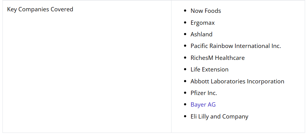 セラドリンサプリメント市場の主要企業は、Now Foods、Ergomax、Ashland、Pacific Rainbow International Inc.、RichesM Healthcare、Life Extension、Abbott Laboratories Incorporation、Pfizer Inc.、Bayer AG、Eli Lilly and Companyです。