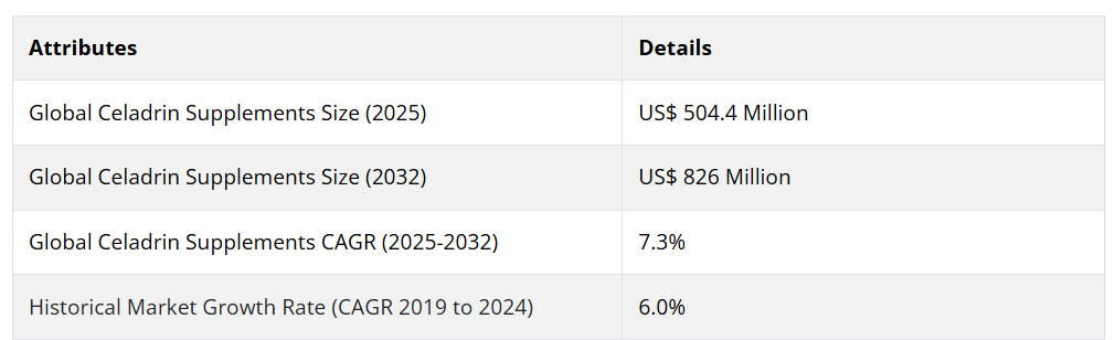 Persistence Market Researchが新たに発表した セラドリンサプリメント市場分析レポートによると、2025年のセラドリンサプリメントの世界売上高は5億440万米ドルにとどまりました。2025年から2032年までのCAGRは7.3%と予測されており、予測期間の終了時には8億2600万米ドルの市場規模に達すると予想されています。