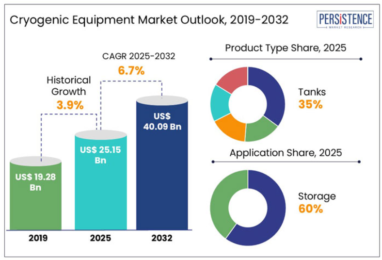 医療用極低温貯蔵装置の世界販売は、ワクチンの保管やバイオ医薬品の保存を原動力として、2032年まで年平均成長率(CAGR)7.8%で成長すると予想されています。さらに、2030年までに世界で640GWに達すると見込まれるLNG(液化天然ガス)発電の増加が、極低温ガス貯蔵の需要を押し上げています。極低温技術の研究開発に対応する技術への投資は、今後、売上をさらに押し上げると見込まれています。