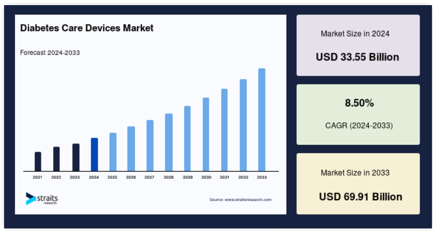 診断された症例の増加、研究と治療の促進といった要因が、2033年までに糖尿病ケア機器市場の需要を大幅に牽引すると考えられます。