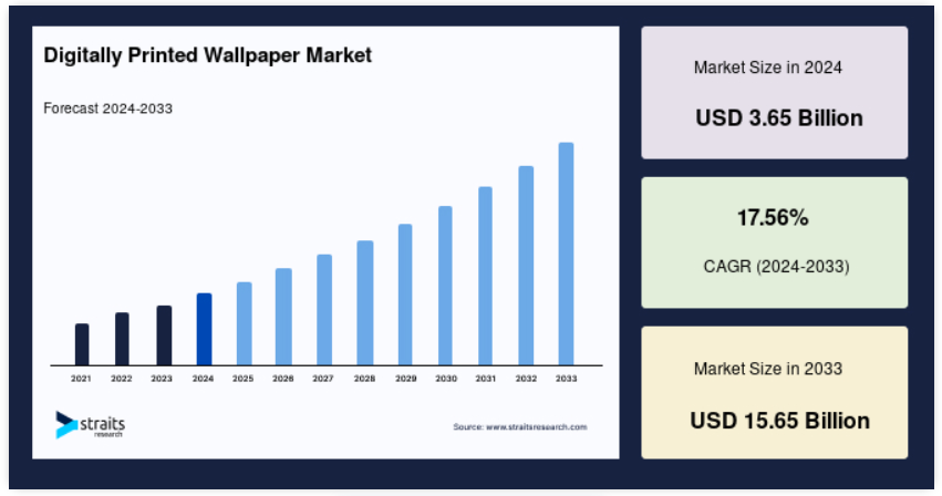近年、地方から都市部への移住者が増加しており、特に住宅部門では建設活動が急増しています。この家庭部門の成長により、家の美観を高めることができるデジタル印刷の壁紙の需要が高まっています。デジタル印刷の壁紙とは、デジタル印刷技術を活用して製造される特定の種類の壁紙を指します。従来型の壁紙とは対照的に、デジタル印刷の壁紙は、精巧なデザイン、パターン、画像を壁紙の表面に正確に再現するために、スクリーン印刷や表面印刷などのプロセスではなく、デジタルプリンターを使用しています。これは、多様な用途にパーソナライズされた最高品質の壁紙を生成するために利用されています。