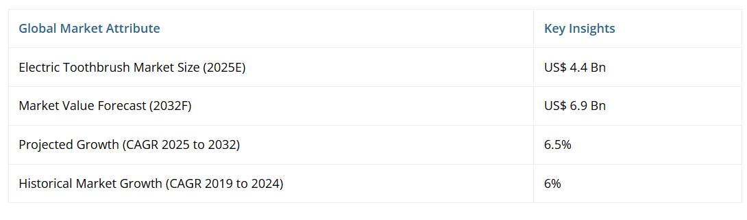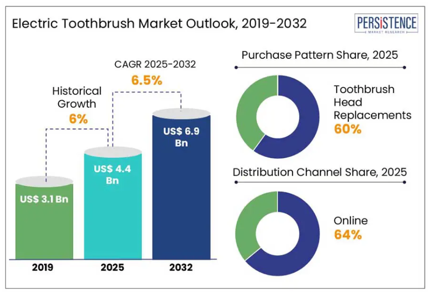 世界の電動歯ブラシ市場は、2025年の44億ドルから2032年までに69億ドルへ成長し、2025年から2032年にかけて年平均成長率(CAGR)6.5%で推移すると予測されております。口腔衛生への意識の高まり、技術革新、可処分所得の増加により需要が拡大しています。