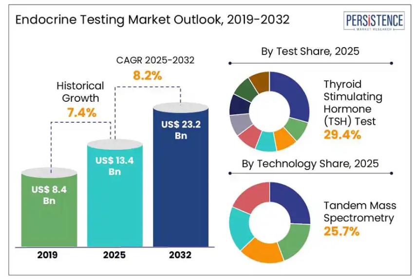 世界の内分泌検査市場規模は、2025年に134億ドルに達すると予測されており、2032年までに232億ドルに達し、年平均成長率(CAGR)8.2%を記録する見込みです。