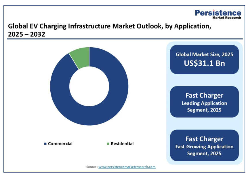 主要な種類:商用セグメントは、公共充電拠点の拡大、フリートの電動化、電気バス市場の急成長により、2025年にはEV充電インフラ収益の90%以上を占めると予測されます。これは政府の強力な資金支援と民間パートナーシップによって支えられています。