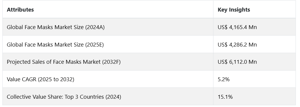 世界的なフェイスマスク市場は、5.2%のCAGRで拡大し、2032年末までに現在の市場規模42億8,620万米ドルから61億1,200万米ドルに達すると予測されています。
