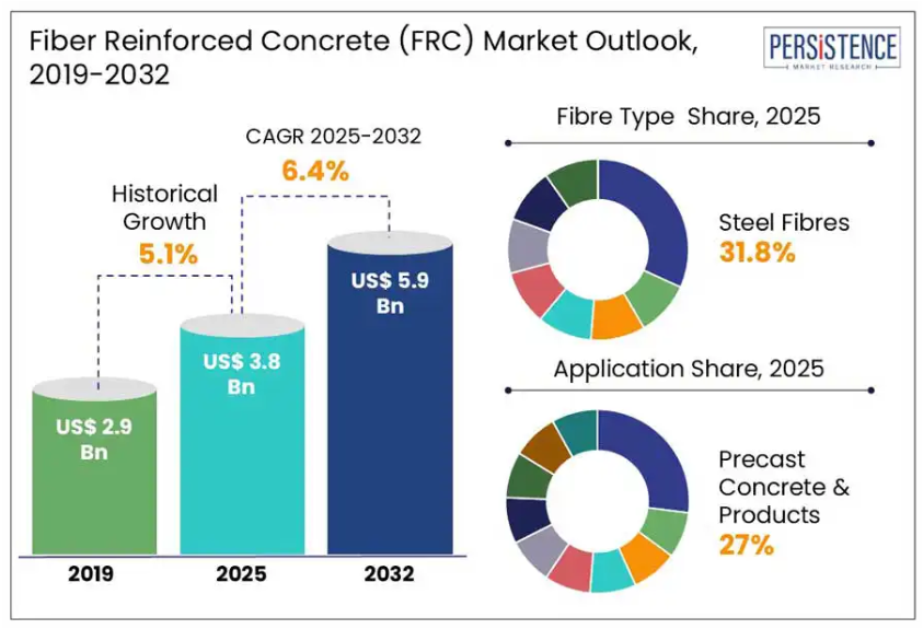 パーシステンス・マーケット・リサーチ社によりますと、世界の繊維補強コンクリート(FRC)市場は、2025年の38億ドルから、2032年までに6.4%の安定した年平均成長率(CAGR)で59億ドルに達すると予測されております。この成長は主に、インフラ、産業、商業プロジェクトにおいて、高性能でひび割れに強く、耐久性に優れた建設資材への高い需要によって牽引されております。