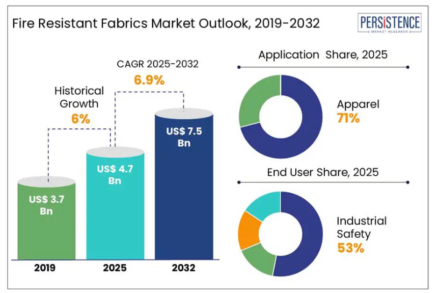 世界の耐火性布地市場の規模は、2025年の47億ドルから2032年までに75億ドルへ成長し、予測期間中の年平均成長率(CAGR)は6.9%と推定されております。