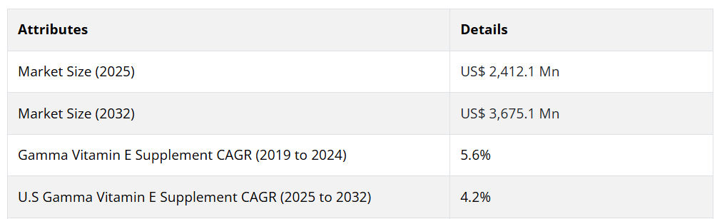 市場調査および競合情報プロバイダーであるPersistence Market Researchによる「ガンマビタミン E サプリメントに関する調査」によると、2019年から2024年にかけて、ガンマビタミンEサプリメントの価値は年平均成長率5.6%程度増加しました。予測期間中の絶対的なドル機会は15億米ドルであり、2032年までに36億7,510万米ドルに達すると予測されています。