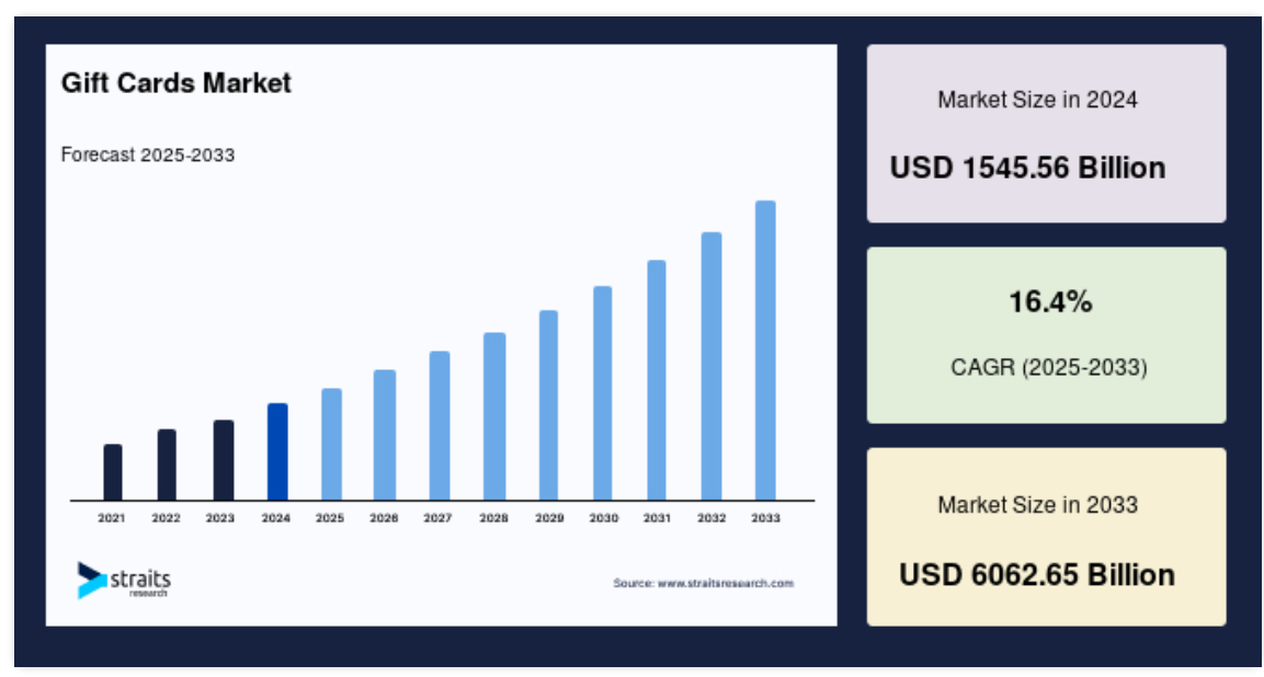 世界のギフトカード市場規模は2024年に1兆5,455億6,000万米ドルと評価され、2025年に1兆7,990億3,000万米ドルから2033年には6兆626億5,000万米ドルに達し、予測期間(2025年~2033年)には16.4%のCAGRで成長すると予想されています。