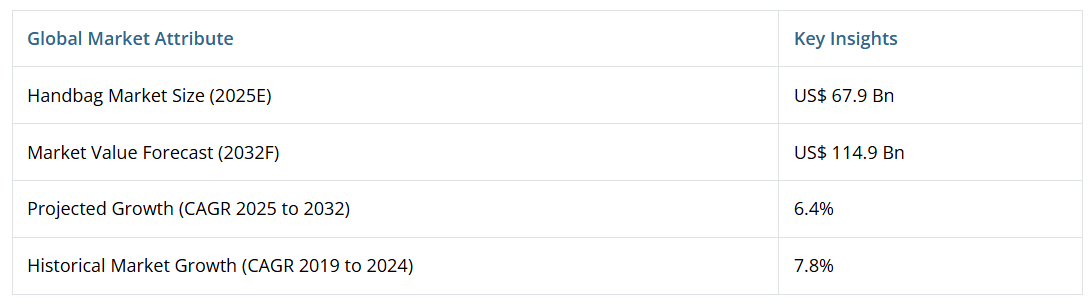 世界のハンドバッグ市場規模は、2025年の679億ドルから2032年までに1,149億ドルへ拡大し、この期間の予測年間平均成長率(CAGR)は7.8%と見込まれております。