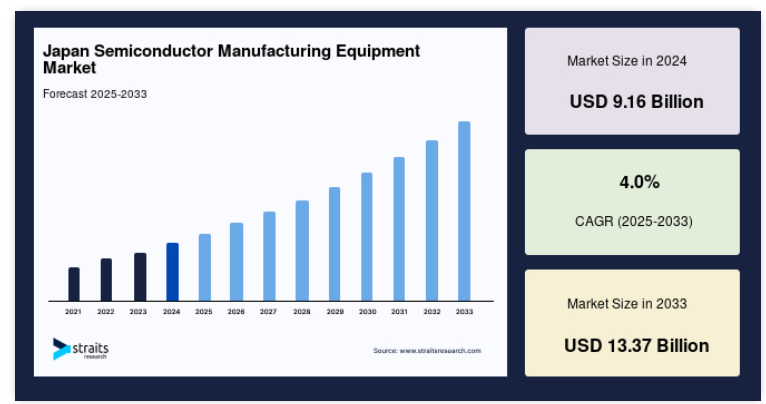 日本の半導体製造装置市場は、2024年に91億6,000万米ドルと評価され、予測期間(2025-2033年)において年平均成長率(CAGR)4.0%で成長し、2025年には95億1,000万米ドルから2033年までに133億7,000万米ドルに達すると見込まれております。