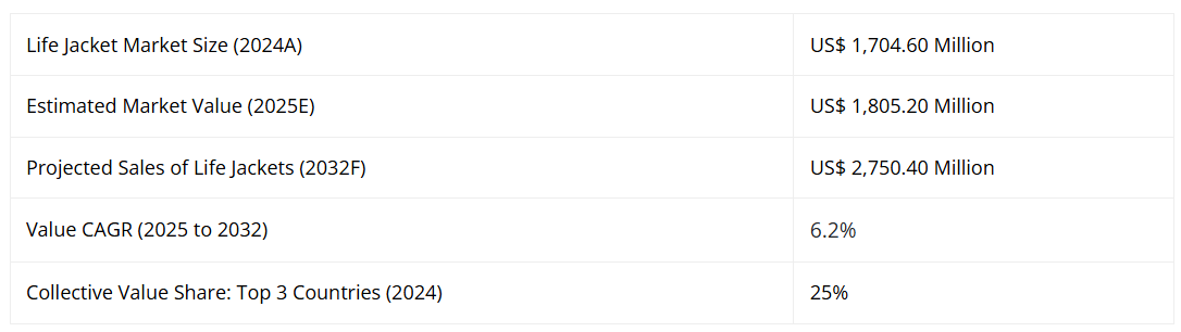 その結果、ライフジャケットに対する需要が急増し、2019年から2024年にかけて年平均成長率(CAGR)5.9%で市場が拡大しました。2032年までには6.2%のCAGRで成長を続けると予測されています。