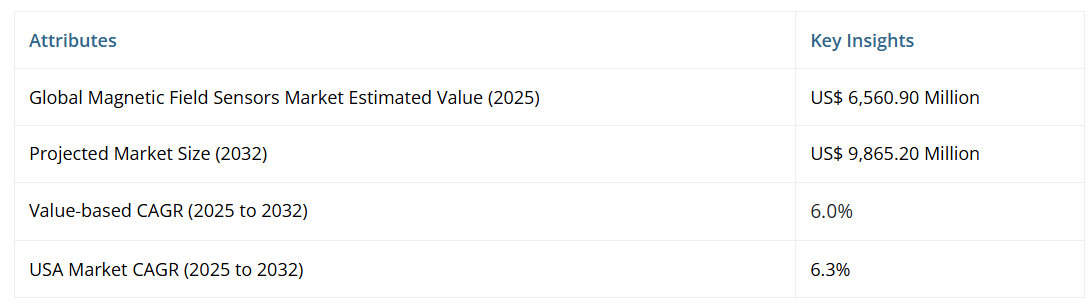 磁界センサーの世界販売は、過去期間(2019年から2024年)において約8.3%のCAGRで増加しました。2025年から2032年にかけて、世界の磁場センサー需要は年平均成長率(CAGR)7.5%で増加する見込みです。これにより、64億ドルという絶対的な市場機会が創出されます。