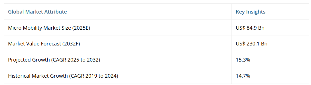 世界のマイクロモビリティ市場規模は、2025年の849億ドルから2032年までに2,301億ドルへ拡大し、2025年から2032年にかけて年平均成長率(CAGR)15.3%で成長すると予測されております。