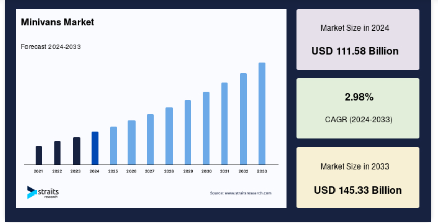 世界のミニバン市場規模は、2024年には1115.8億米ドルと評価され、2025年には1149.0億米ドルから成長し、予測期間(2025年~2033年)に2.98%のCAGRで成長して、2033年には1453.3億米ドルに達すると予測されています。