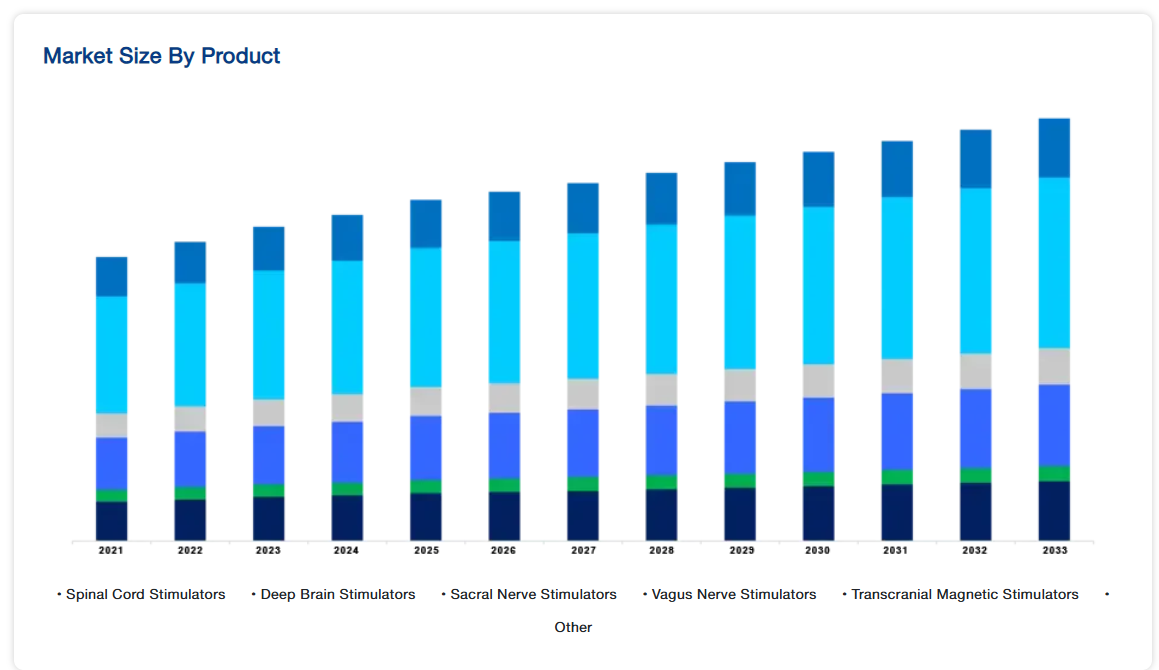 アルツハイマー病、パーキンソン病、てんかん、慢性疼痛などの神経疾患の罹患率の上昇が、世界市場を大きく牽引しています。主に人口の高齢化とライフスタイルの変化により、これらの疾患がより一般的になるにつれて、神経調節療法を含む効果的な治療オプションに対する需要が高まっています。神経疾患は、世界的に障害や不健康の主な原因となっており、この増大する負担に対処するための革新的な治療ソリューションが緊急に必要とされています。