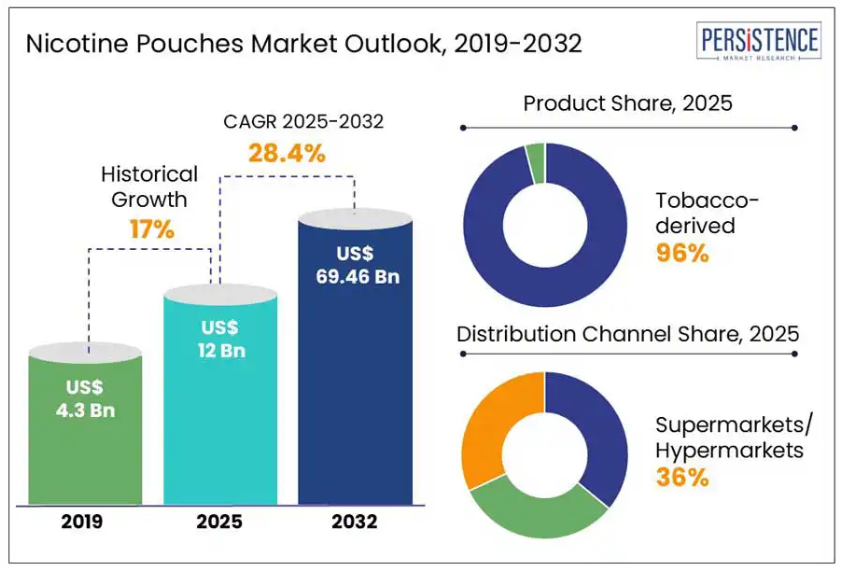 世界のニコチンパウチ市場規模は、2025年に120億米ドルまで大幅に成長すると予測されています。さらに、2025年から2032年の間に694億米ドルまで成長し、2032年までに28.4%の高いCAGRを記録すると予想されています。Persistence Market Researchの報告書によると、ニコチンパウチ市場は、消費者の行動が煙のない・タバコのない代替品への移行という大きな変化に後押しされ、急速な成長を遂げています。燃焼式タバコの健康への悪影響に関する意識の高まりが、より清潔でリスクの低いニコチン摂取方法の需要を促進しています。この中で、ニコチンパウチは、喫煙の有害な副産物なしに、目立たず、無臭で、社会的に受け入れられる体験を提供するため、注目すべきイノベーションとして浮上しています。