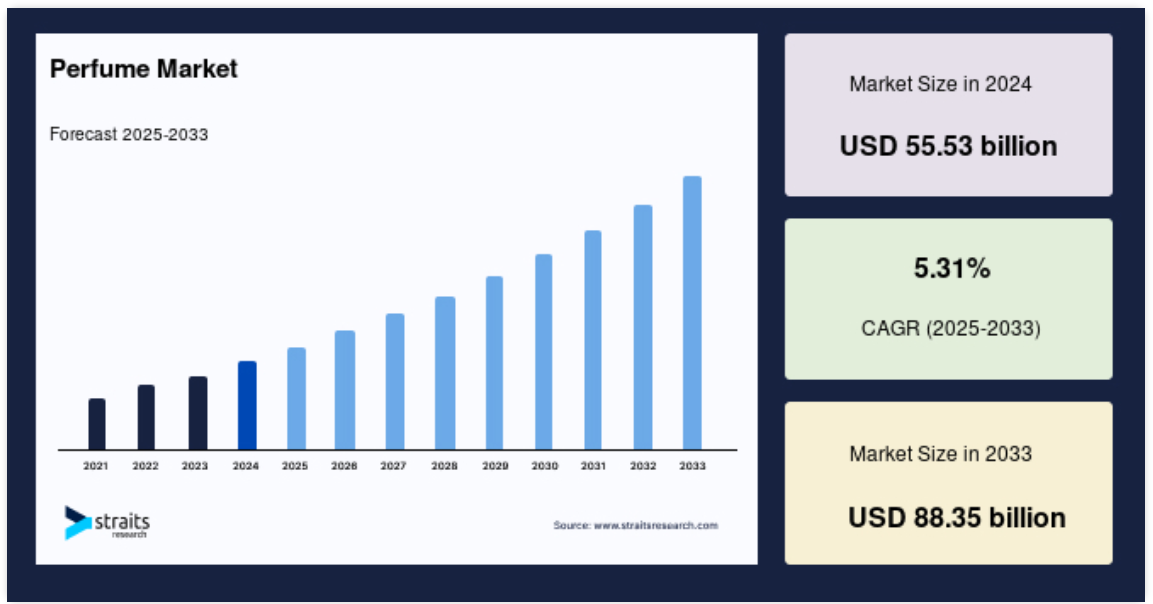 世界の香水市場規模は2024年に555.3億米ドルと評価され、2025年には581.4億米ドル、2033年には883.5億米ドルに達すると予測され、予測期間中(2025年~2033年)のCAGRは5.31%です。