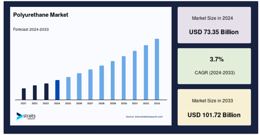 世界のポリウレタン市場規模は、2024年には733.5億米ドルと評価され、2025年には760.6億米ドル、2033年には1017.2億米ドルに達すると予測されています。予測期間(2025年~2033年)中のCAGRは3.7%で成長すると予測されています。