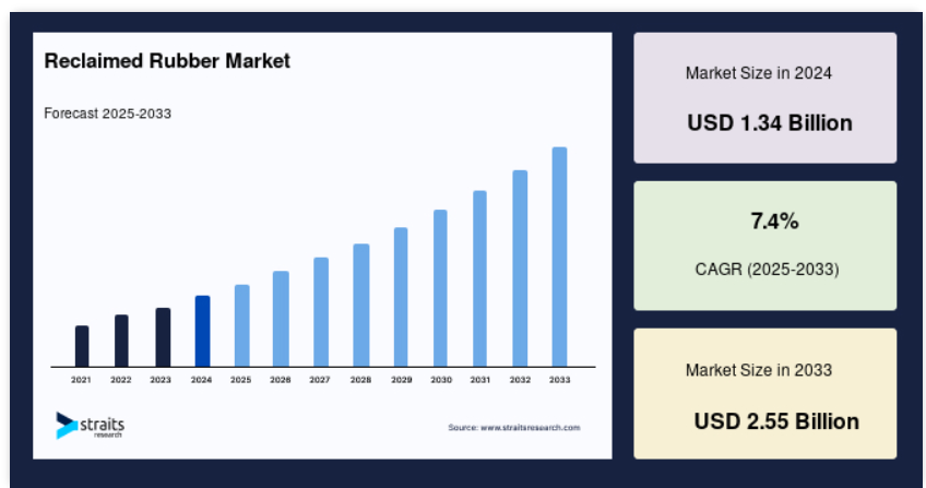 再生ゴムの世界市場規模は、2024年に13.4億米ドルと評価され、2025年の14.4億米ドルから成長し、2033年には25.5億米ドルに達すると予測され、予測期間(2025年~2033年)の年平均成長率は7.4%です。