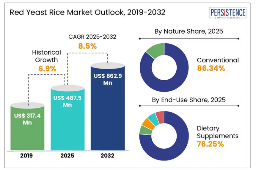 世界の紅麹米市場は、2025年に4億8750万ドル規模に達すると予測されており、2025年から2032年にかけて年平均成長率(CAGR)8.5%で成長し、2032年には8億6290万ドルの規模に達する見込みです。